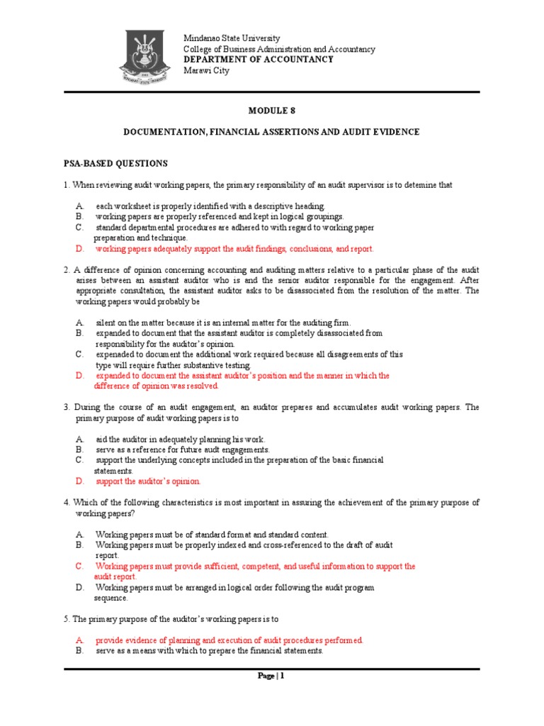 Module 8 Documentation Financial Assertions Audit Evidence Pdf Internal Control Audit